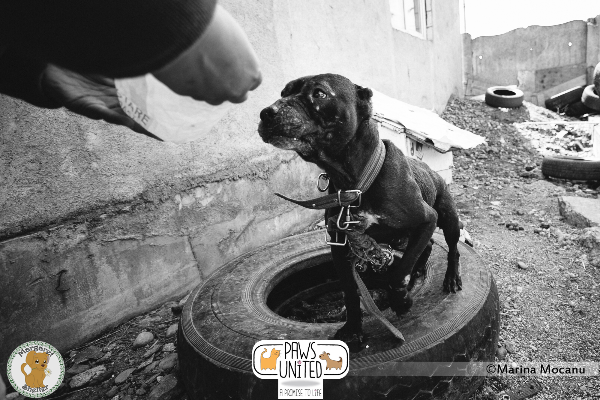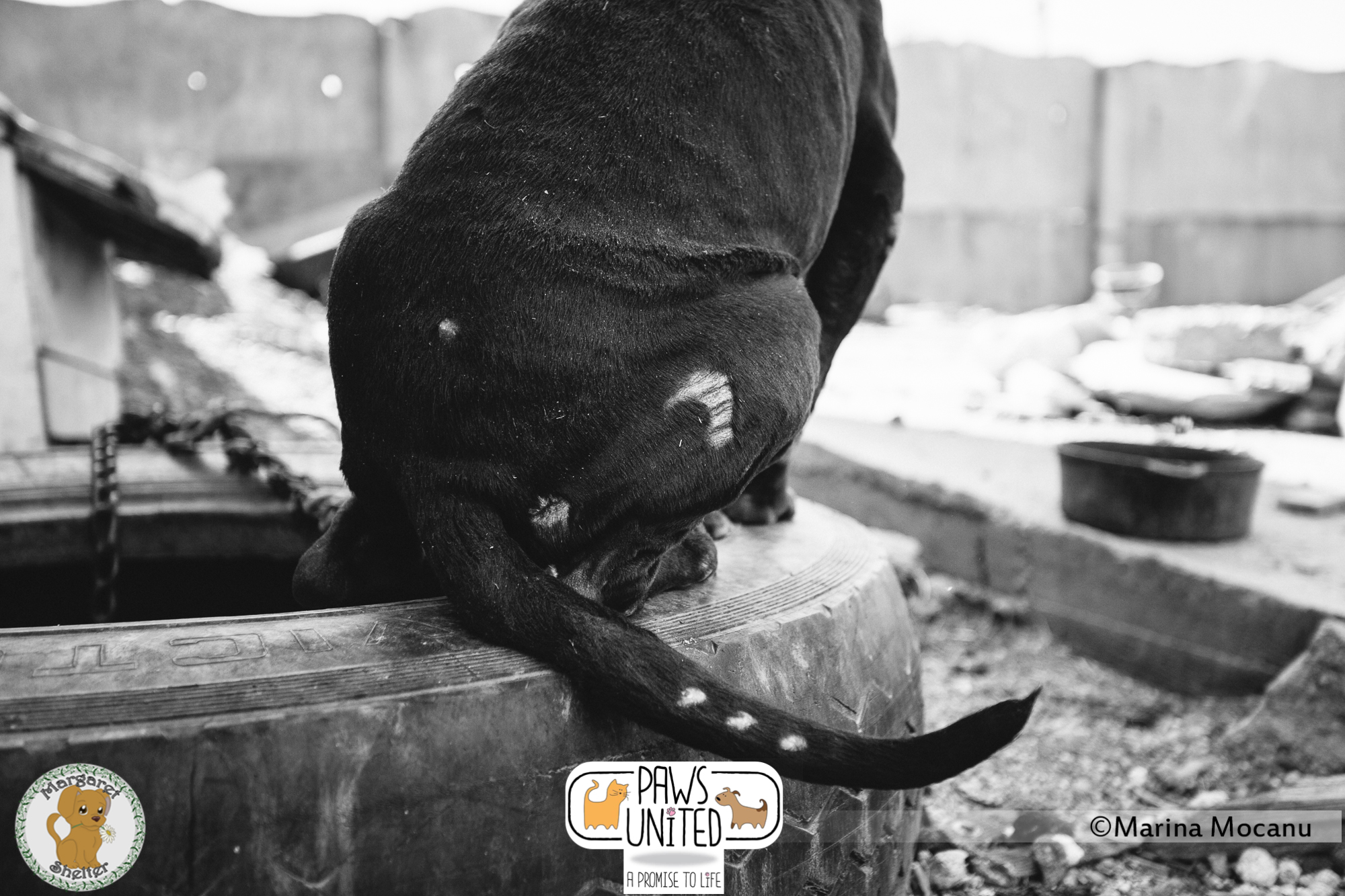 Numa lebte bisher mit ihrem Besitzer der dachte es wäre das Beste sie an einer sehr kurzen Kette zu halten. Sie lebt so schon ihr ganzes Leben lang – ein Leben das ihre armen Knochen deformiert hat wie man an ihren Beinen sehen kann. Leider toleriert Numa keine anderen Hunde und danach zu urteilen wie sie sich verhält denken wir und der Arzt, dass sie für Hundekämpfe ausgebildet und missbraucht wurde – was sehr häufig mit Pitbulls in Rumänien passiert. Sie ist voller Kampfwunden die diese Befürchtung leider stützen. Gestern haben wir Numa von einem Autohändler in Pitesti gerettet wo sie so gehalten wurde. Sie hat einen verbreiteten Hautpilz und Fellprobleme und läuft unsicher wegen ihrer Knochenprobleme. Wahrscheinlich hat sie noch nie in ihrem Leben einen Arzt gesehen.